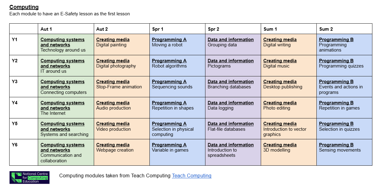 • Our computing curriculum is implemented through 6 week topics and is a learning journey with concepts which weave throughout the whole curriculum.